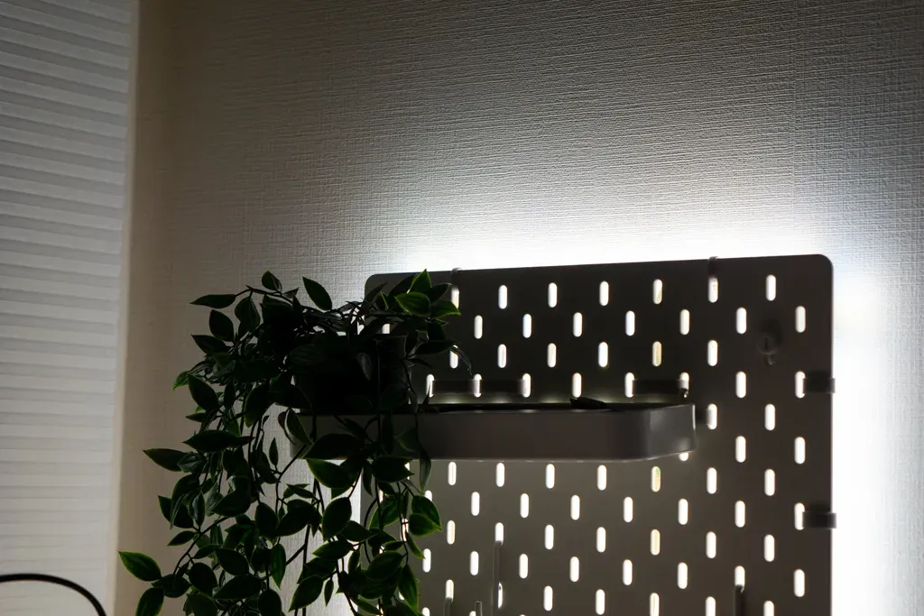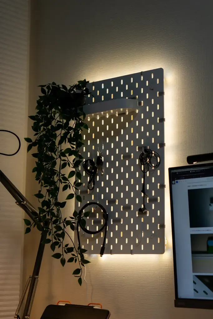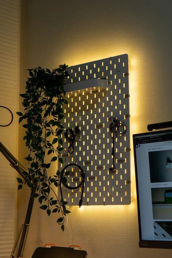 有孔ボードの後ろに間接照明を取り付けて浮遊感を演出している。とても良い。