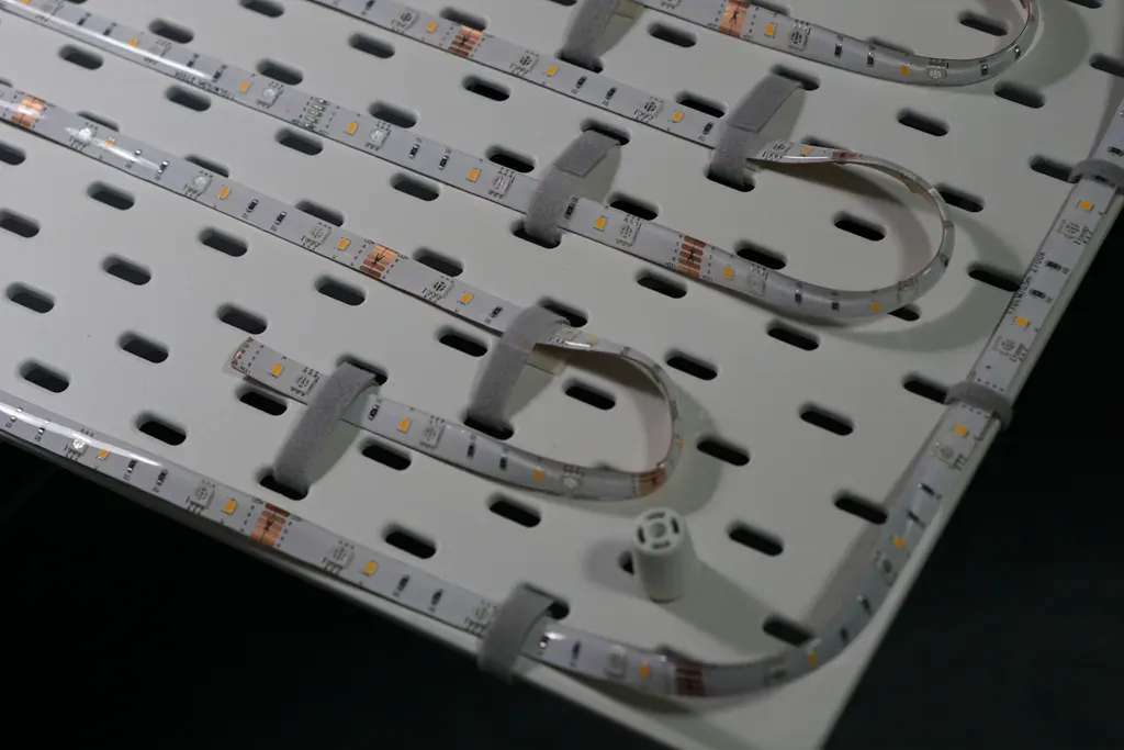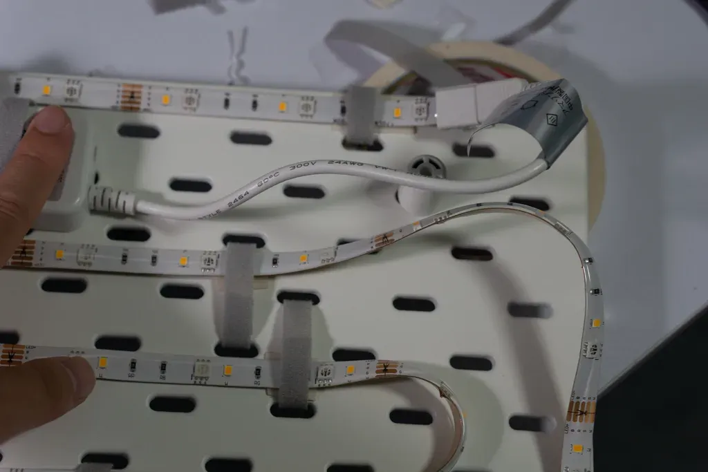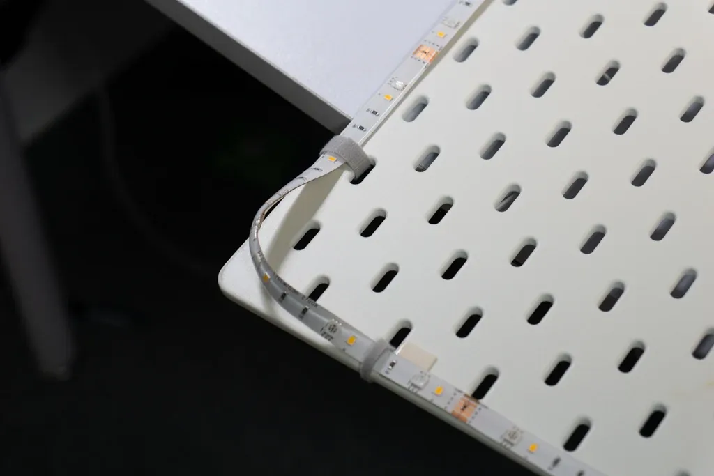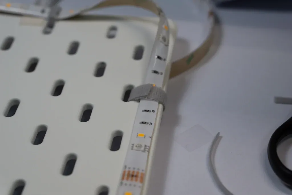 テープライトの再利用ができるように、マジックテープでLEDテープライトを有孔ボードに固定することにした。